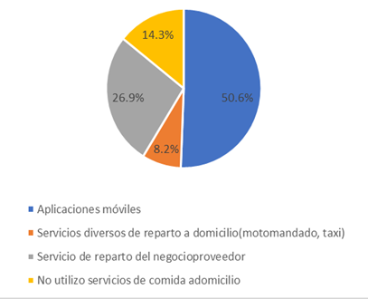 De los 384 informantes el 60.7 % manifestó ser del sexo femenino, el 39.3% del sexo masculino, esto equivale a 233 mujeres y 151 hombres respectivamente. El 93.3% declaró ser soltero en su estado civil. Del total de la muestra, el 50.6% afirmó que utilizan aplicaciones móviles para solicitar alimentos a domicilio, el 26.9% utiliza servicios de reparto del negocio proveedor, mientras que el 8.2% de los informantes utiliza diversos servicios como tipo motomandado, taxis particulares, etcétera., el 14.3 % restante no contestó.