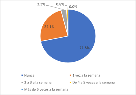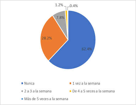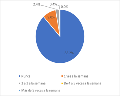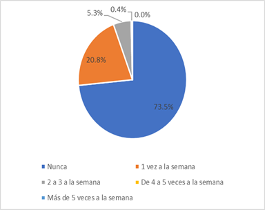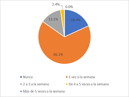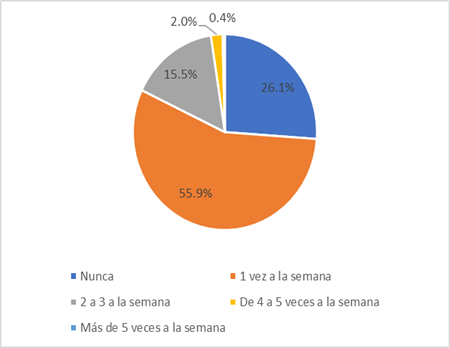 Los universitarios expresan que en relación con la frecuencia de uso de las aplicaciones móviles para el consumo de alimentos a domicilio, el 55.9% lo utiliza una vez a la semana, el 15.5% de ellos utiliza las aplicaciones móviles de 2 a 3 veces a la semana y un 2.0% lo realiza de 4 a 5 veces en una semana. El 26.1% no contestó.