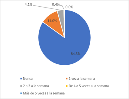La frecuencia de consumo de legumbres, alimentos crudos de tipo vegetal, frutas y abarrotes, el 84.5% los universitarios encuestados declaran nunca haberlo solicitado, el 11% manifestó haberlo hecho una vez por semana y el 4.1% lo realiza de 2 a 3 veces por semana.