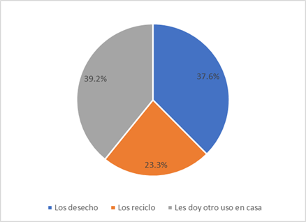 Es importante destacar que existe un comportamiento singular relacionado con la conciencia del reutilización y reciclaje que llamó mucho la atención en las respuestas recibidas. A los jóvenes universitarios se les cuestionó sobre lo que hacen con los envases y empaques de los alimentos recibidos después de su consumo: 39.2% de los universitarios les da otro uso en casa y el 23.3% los recicla, un 37.6% afirmó desecharlos.