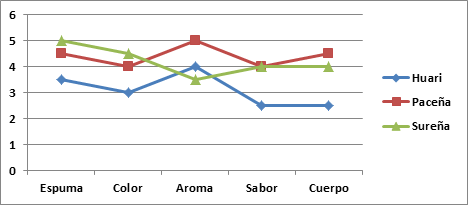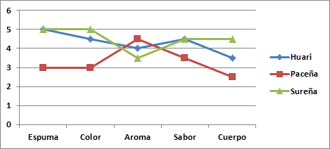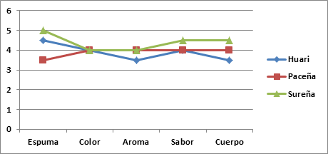 Según se aprecia en el gráfico 1 en una escala del 1 al 5 (siendo 1 pésimo y 5 excelente), la percepción después de la degustación a ciegas del primer grupo fue: Sureña Bicentenario obtuvo mayor calificación en sabor, cuerpo y espuma. Paceña en general obtuvo una calificación de 4 para todos sus atributos, a excepción de espuma, atributo en el cual obtuvo un puntaje de 3,5. Huari estuvo por debajo de ambas marcas en dos atributos, en el aroma y el cuerpo; sin embargo, al margen de aquello obtuvo una buena calificación en espuma.