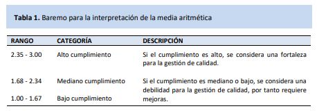Para procesar los resultados de la aplicación del cuestionario se recurrió al método de la estadística descriptiva, y se empleó la media aritmética. En la tabla 1 se establece el baremo para su interpretación.