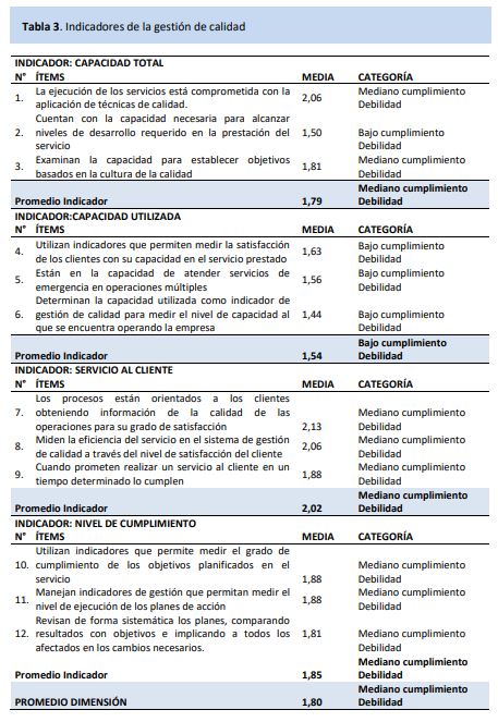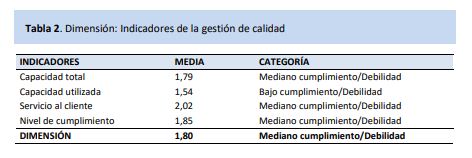 Ahora bien, al desglose de los indicadores utilizados para medir la dimensión, de seguido se especifican los resultados obtenidos, mostrados en la tabla 3, la cual recoge el resultado de la dimensión indicadores de la gestión de calidad y de sus indicadores: capacidad total, capacidad utilizada, servicio al cliente y nivel de cumplimiento.