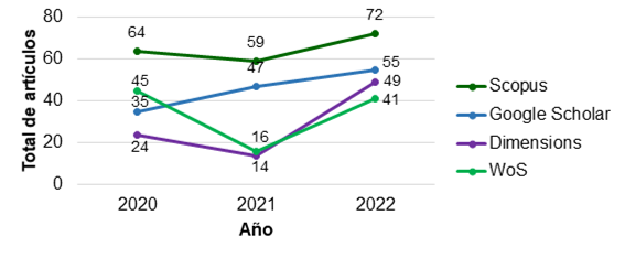 Figura 1. Cantidad de producciones científica recuperadas entre los años 2020 y 2022 en revistas indexadas en Scopus, Web of science, Google Scholar y Dimensión relacionadas con el tema de investigación
