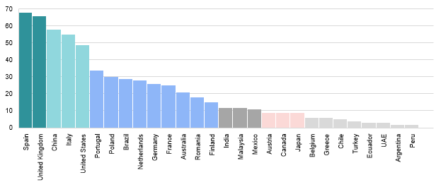 Al analizarse los países con más publicaciones científicas relacionadas con la servitización, como se aprecia en la gráfica que se muestra en la Figura 2, España es el que más se destaca con 68 artículos. El autor más citado en dicho país fue Óscar F. Bustinza con una investigación donde fue coautor (Baines et al., 2017) con 747 citas, quien trabajó el tema de servitización, innovación producto-servicio, toma de decisiones basada en datos y analítica predictiva.