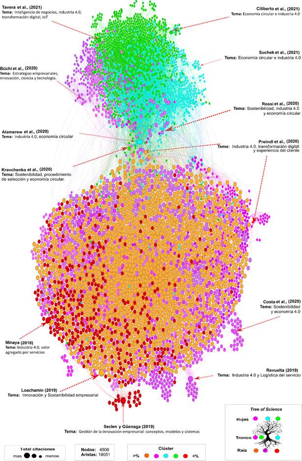 Los autores en la categoría “Hoja”, como Suchek et al. (2021), investigaron sobre economía circular e industria 4.0. Destacaron la importancia de la innovación para impulsar la transición hacia una economía circular y enfatizaron la necesidad de que las empresas adopten nuevos modelos de negocio que apoyen las prácticas de economía circular y señalan la importancia del compromiso y la colaboración de las partes interesadas en el desarrollo y la implementación de iniciativas de economía circular.